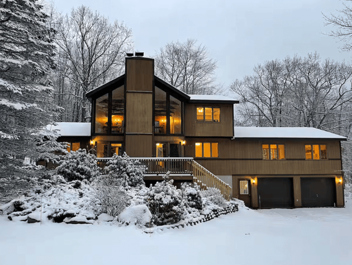 This exterior shot of Lake Harmony’s family friendly chalet hosted by Vanesa screams warmth and holiday memories.