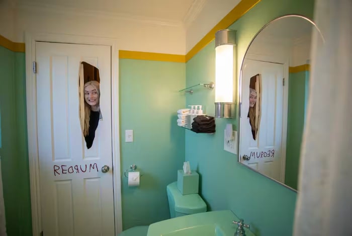 The Horror Themed Cabin in Big Bear, California and hosted by Unique Stays Club features a bathroom inspired by The Shining and includes both built in escape room experience as well as lots of on theme entertainment options.