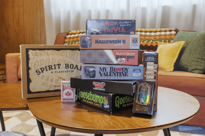 A bit spooky and a lot of fun, a deck of tarot cards or astrology/symbology books are great bookshelf additions- especially if they are mixed with other oddities. If your property is a bit more light-hearted, a Magic 8 Ball or a vintage Clue game can be the perfect living room accessory. You could also consider adding versatile statement pieces like a vintage radio, player piano, or an antique phonograph complete with scratchy hits from the 1920’s- cool and creepy. These small touches make a huge difference in your guests’ spooktacular experience.